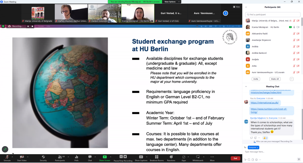 Nakon kratkih prezentacija partnerskih univerziteta, studenti su bili u mogućnosti da u breakout sobama porazgovaraju sa kolegama, postave pitanja i reše nedoumice koje imaju.