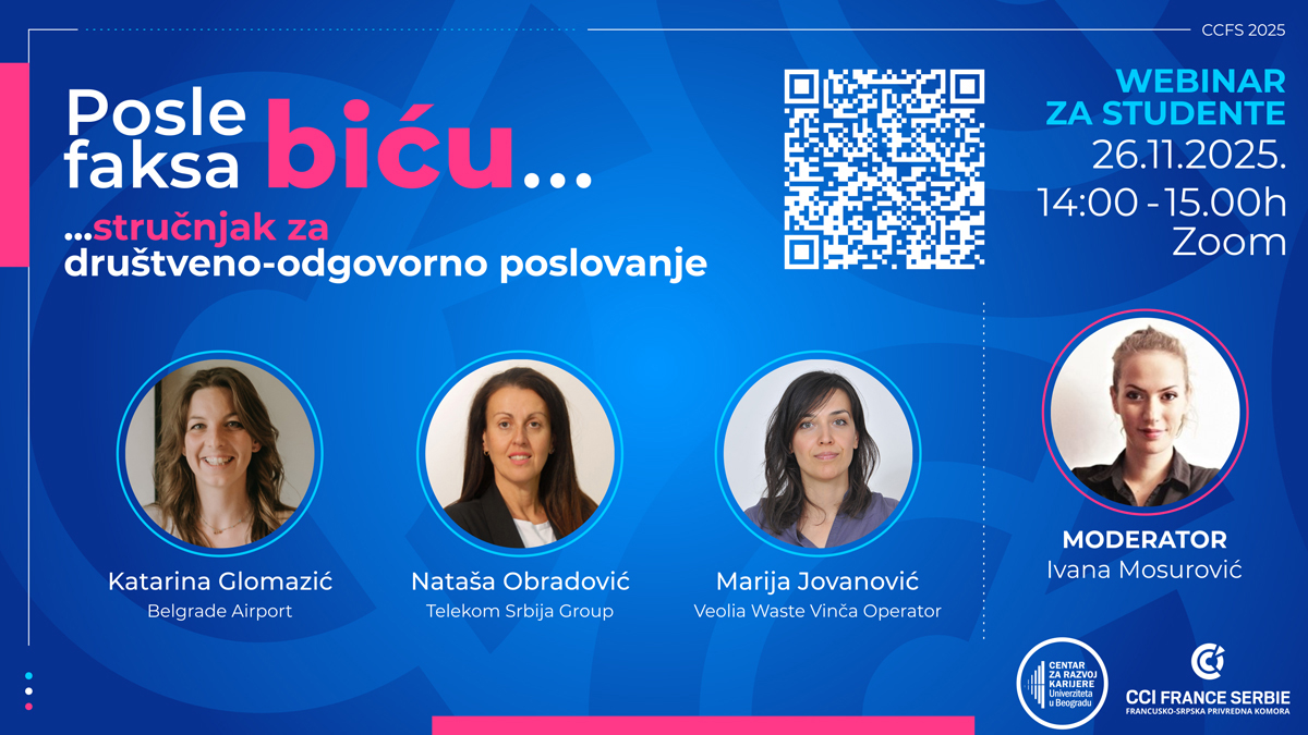 Centar za razvoj karijere i savetovanje studenata Univerziteta u Beogradu u saradnji sa Francusko-srpskom privrednom komorom organizuje vebinar pod nazivom "Posle faksa biću… Stručnjak za društveno-odgovorno poslovanje".