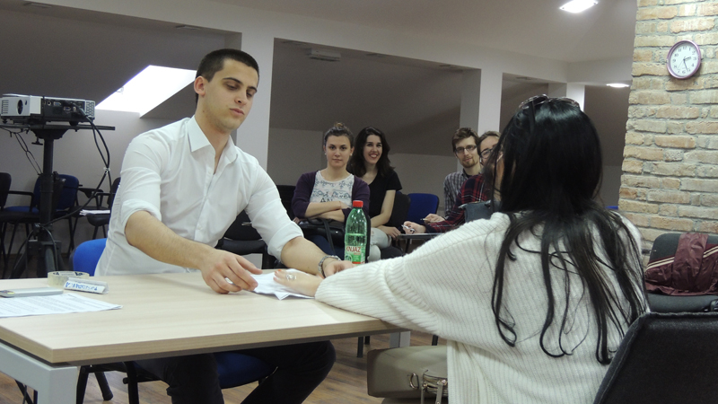 Beograd, 13.4.2016. - Centar za razvoj karijere i savetovanje studenata Univerziteta u Beogradu danas je u zgradi Rektorata organizovao radionicu za studente na temu Intervjua za posao. Na radionici su učestvovali studenti okupljeni oko Unije studenata Užica, koji su tokom radionice mogli da se upoznaju sa poželjnim i nepoželjnim ponašanjem kandidata za posao na razgovoru i kroz interaktivan rad se oprobaju u ulozi intervjuera i kandidata za posao. Radionicu je vodila Marija Jovanović, koordinator programa Centra.