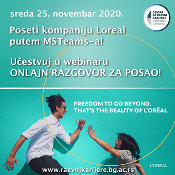 Pozivaju se studenti i studentkinje Univerziteta u Beogradu da se priključe prvoj virtuelnoj poseti kompaniji, koju će organizovati Centar za razvoj karijere u saradnji sa kompanijom L'Oréal Adria Balkan, u sredu, 25. novembra 2020. godine.
